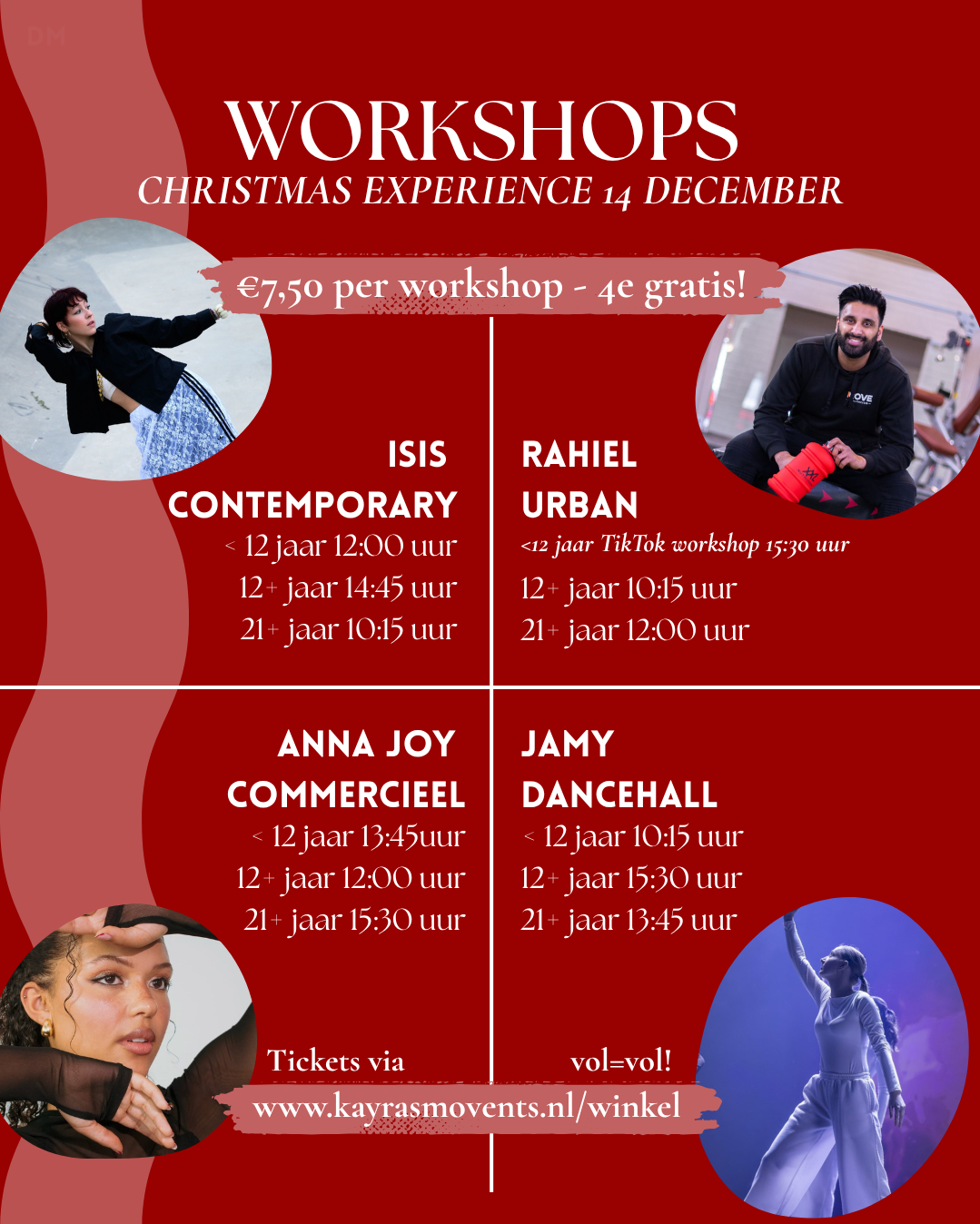 Tijdens de Christmas Experience kun je workshop volgen van dans proffesionals van buitenaf. Koop nu je tickets voor de workshops, want dit wil je niet missen!
