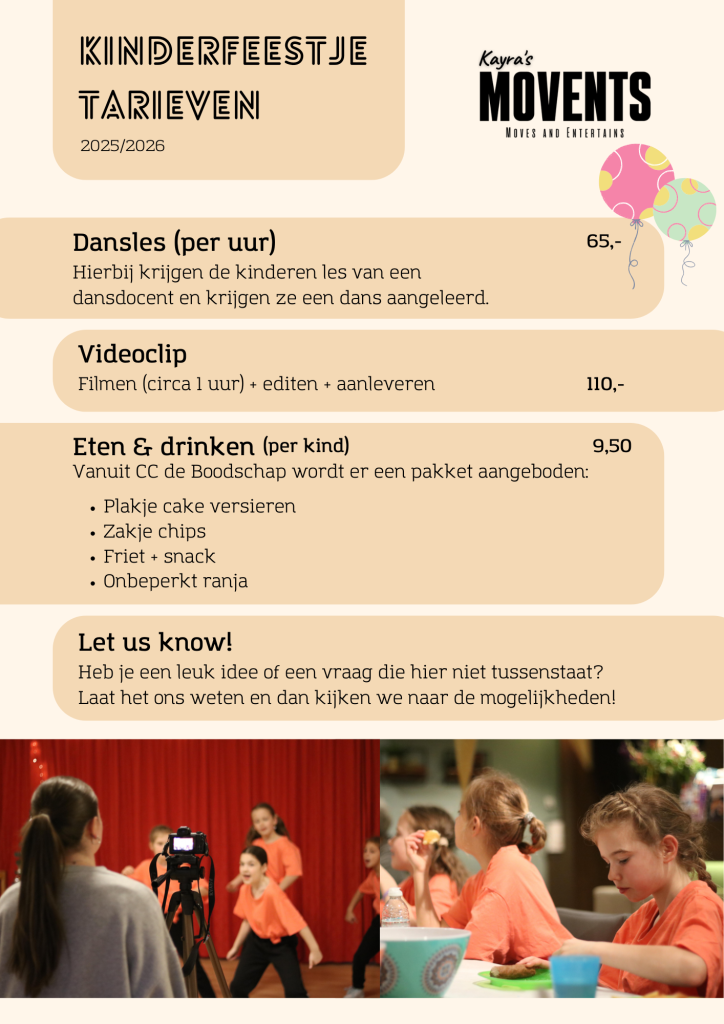 Je kinderfeestje bij ons vieren? Dat kan! Hieronder staan al onze tarieven aangegeven en kun je een voorbeeld van een videoclip zien! Het kinderfeestje kan in CC de Boodschap plaatsvinden, maar mag ook zeker op een andere locatie. Heb je zelf een grote ruimte of een idee voor de videoclip? Laat het ons vooral weten!
